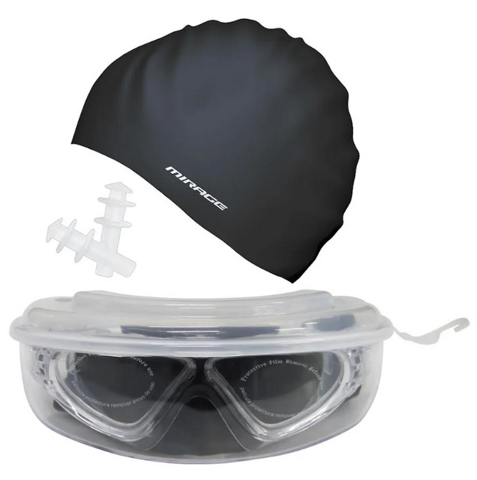 The all new Mirage 3-in-1 Swim Packs come with goggles, silicone cap and ear plugs, all in a reuseable hard case. The Lethal Goggle has an oversized design for complete comfort and improved visibility in all conditions The high grade silicone skirt and rapid adjust buckles make it ideal for sea, surf or pool.