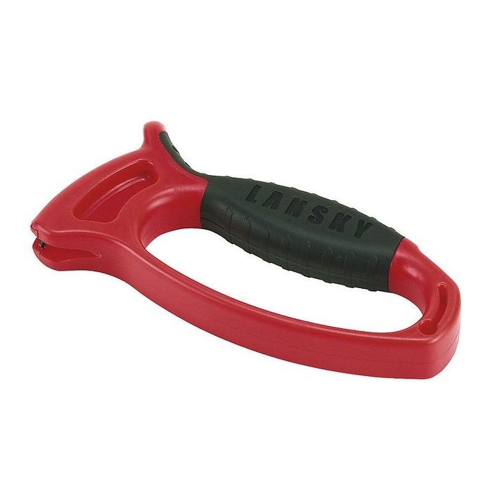 The Lansky tungsten carbide sharpener can be gripped securely in the palm rest. With just a few strokes the knife is sharp again. With a safety thumb rest and roomy, over-molded rubber grip for maximum comfort and control. The lanyard hole is practically for easy attachment to a belt or backpack. Right or left handed use.
