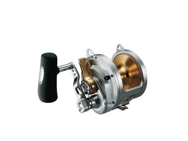 The "2-speed lever drag" allows the angler to switch between high and low gears during use.