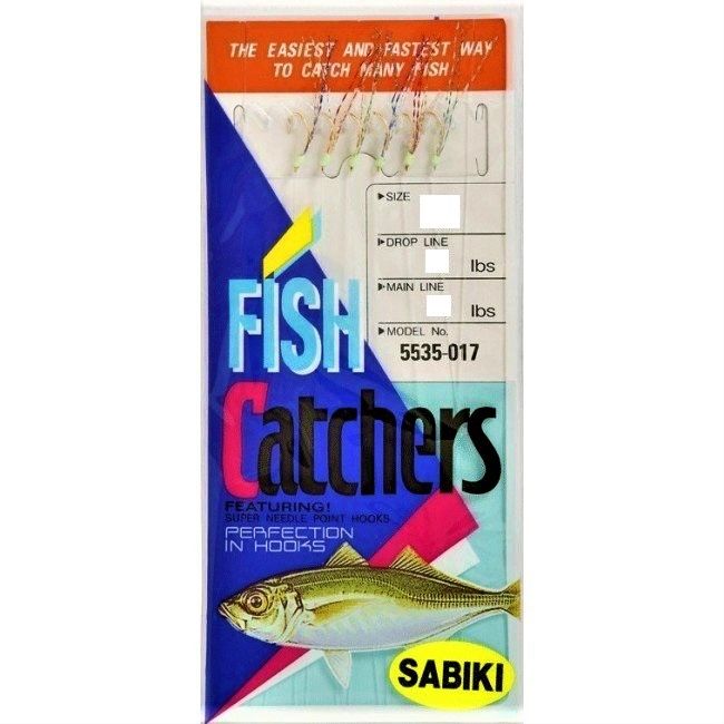 Gold hooks; green glow bead slides on each branch line; hooks dressed with mackerel skin. Rigs vary in length depending on number of hooks, but generally, 10 inches of main line stretches between 4-inch drop lines. Swivels attach at each end of rig. Each rig has hooks in varying numbers, and sizes, plus varying strengths (lb.-test) of main line and branch lines.