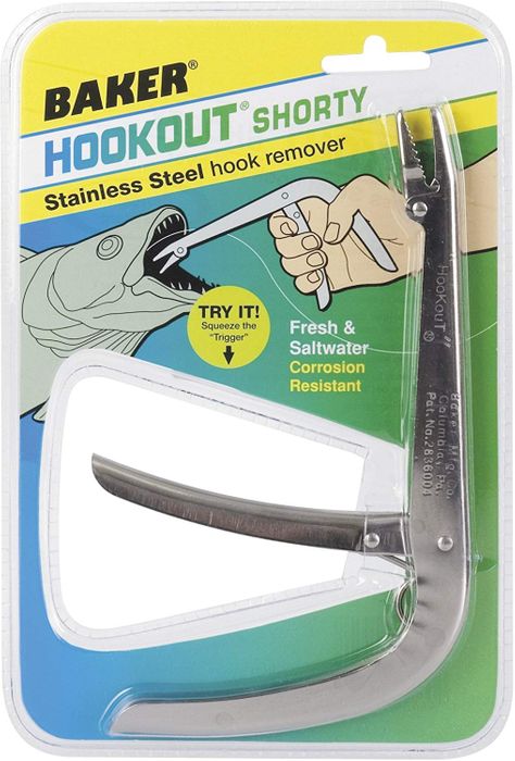 Stainless Steel Shorty HooKouT safely removes hooks, artificial lures and delicate flies with its powerful, spring-operated, non-slip jaws