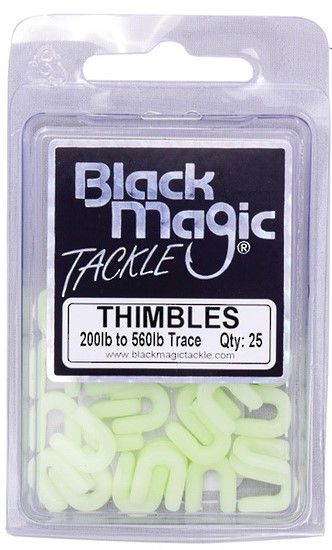 The Black Magic Lumo Thimbles Pk25 are designed to protect fluorocarbon and monofilament lines from abrasion, making them ideal for heavy-duty game fishing rigs.